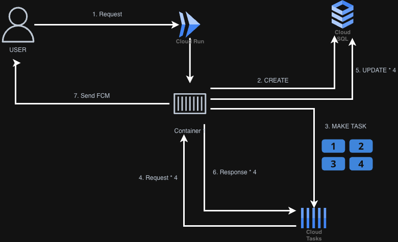 - Cloud Tasks에 n개의 Task를 생성하고, 사용자는 즉시 응답을 받습니다.